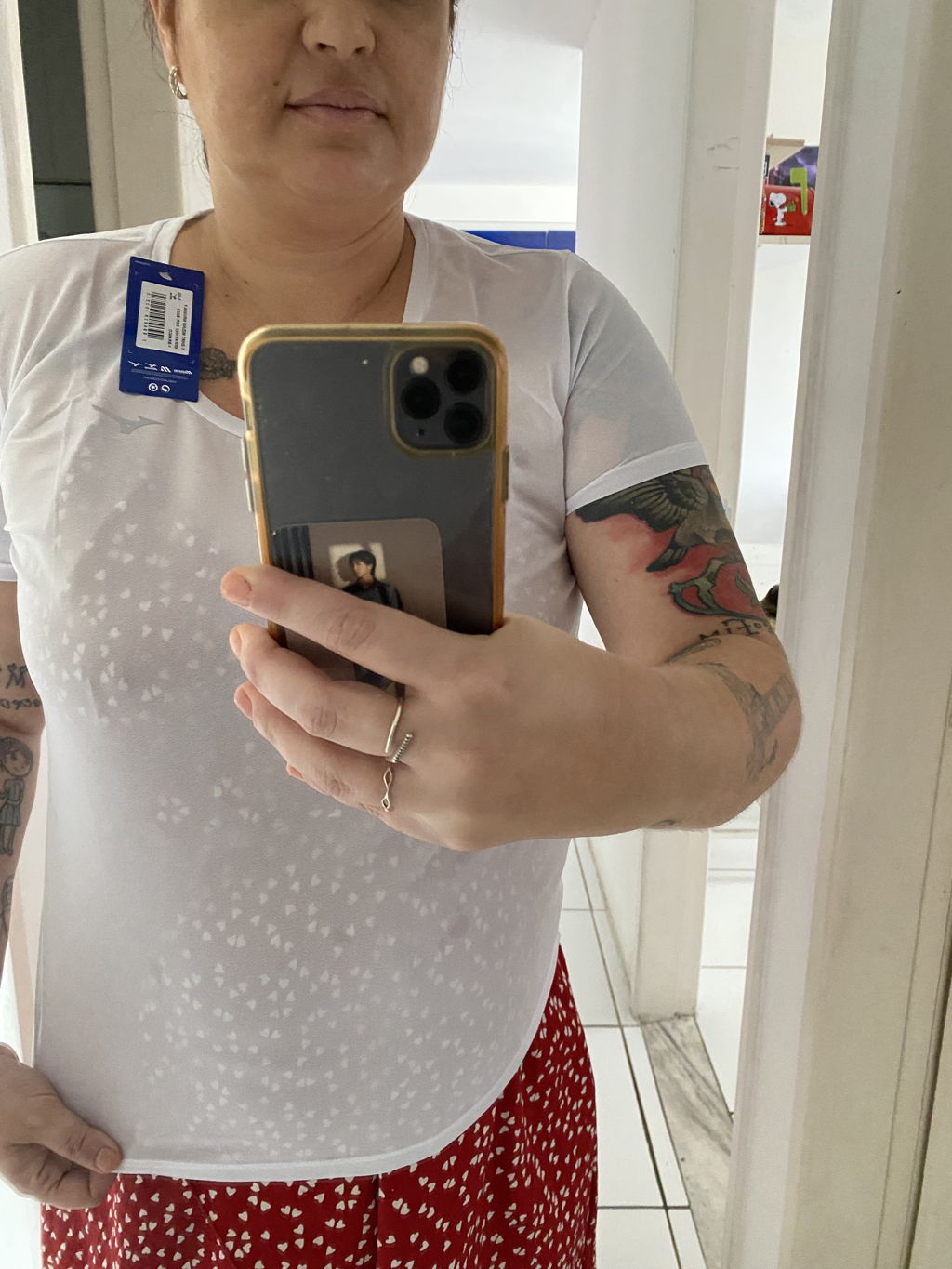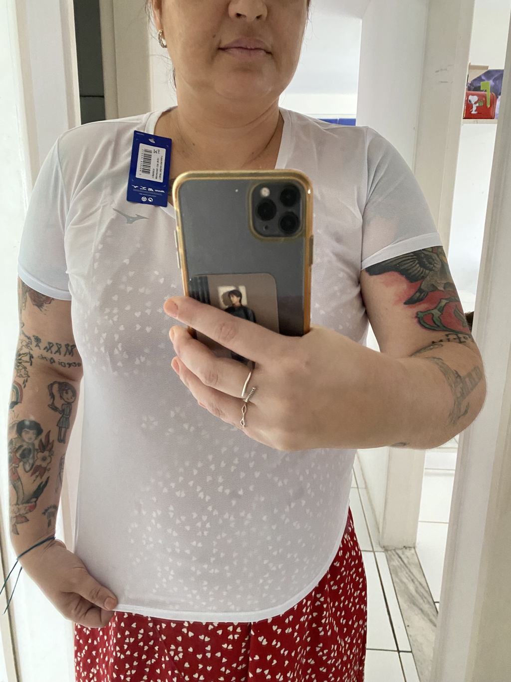A camiseta fica justa nos braços e é EXTREMAMENTE transparente! O tecido podia ser mais encorpado.